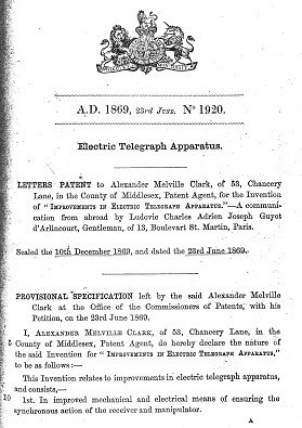 L.C.A.J.G.d'Arlincourt:“Electric Telegraph Apparatus ” British Patent, No.1920 (1869.12.10)