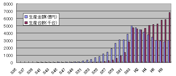 | ● 回線開放の始まった昭和47年度の生産金額は約50億円、台数は約1万台であるが、回線開放を機に生産金額、台数が飛躍的に増大したことが分かる。これらは輸出を含む数値であるが、生産額は63年度がピークで以降漸減している。生産台数はそれ以降も漸増しており、低価格化が進行した。生産額と、生産台数のグラフと並んだのは平成2年度で、単価は約10万円となる。さらに平成7年度には約5万円となっており、成熟の域に達した感がある(ここに示されるのは生産額であり市販価格とは異なる)。 |